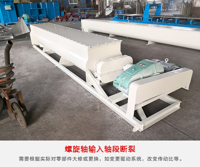 由于螺旋給料機安裝時,螺旋軸同軸度超差或選軸時安全系數(shù)偏低等引起,根據(jù)生產(chǎn)需要進行設(shè)備改造維護,當(dāng)工藝變化,超出設(shè)備性能范圍時,繼續(xù)運行會造成設(shè)備快速損壞,甚至滿足不了生產(chǎn)工藝要求,影響正常生產(chǎn)。需要根據(jù)實際情況和現(xiàn)場條件,對零部件大修更換,如變更驅(qū)動系統(tǒng),改變傳動比,提高備件材料性能或尺寸變化,直至更換設(shè)備。