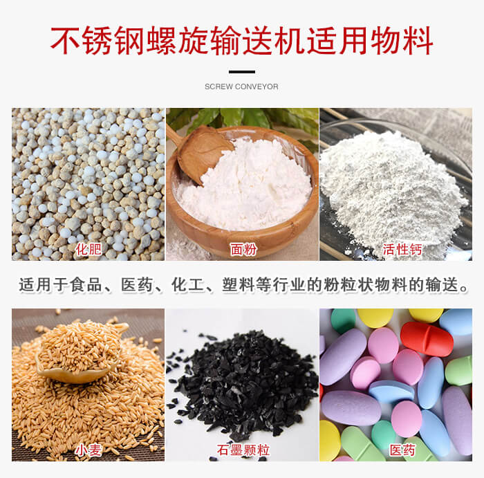 注:垂直式不銹鋼螺旋輸送機(jī)適宜垂直或大傾角輸送粉狀、粒狀、非黏性的物料,如:糧食、飼料、化工原料、水泥等,不適宜輸送輸送塊狀、粘性及流動(dòng)性強(qiáng)的物料,如:粉煤灰。