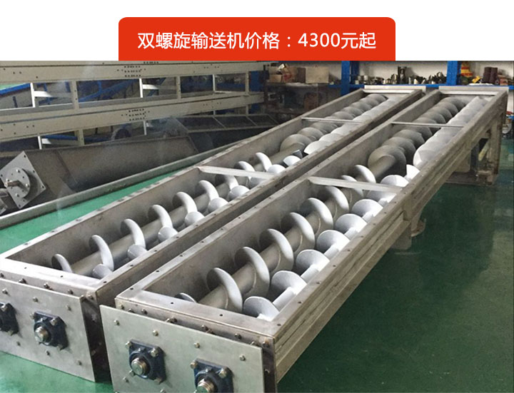 雙螺旋輸送機依靠兩根螺旋旋轉輸送體積大,流動相差的物料,其價格主要與螺旋軸結構,材質,型號等不同存在差異。