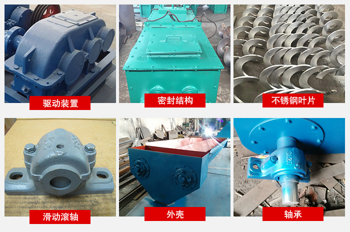 粉末螺旋輸送機本體由頭部軸承、尾部軸承、懸掛軸承、螺旋、機殼、蓋板及底座等組成。 驅動裝置由電動機、減速器、聯軸器及底座所組成。
